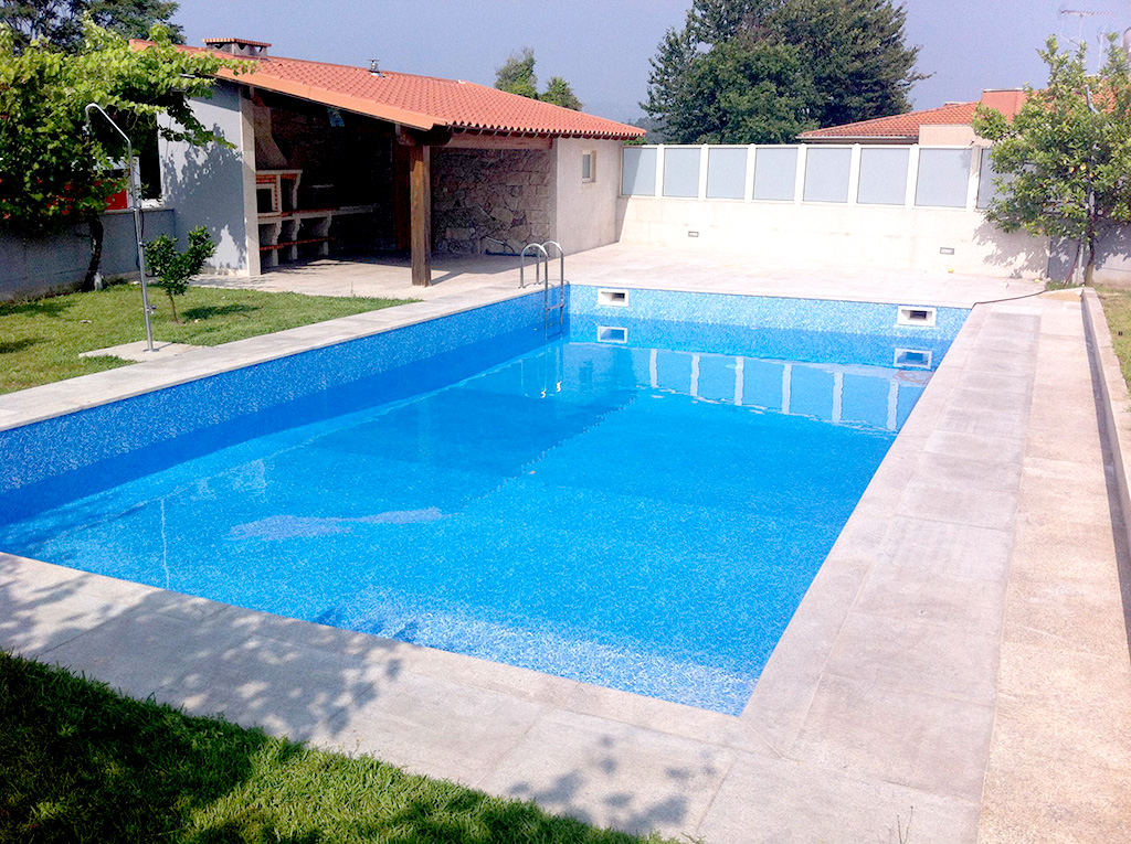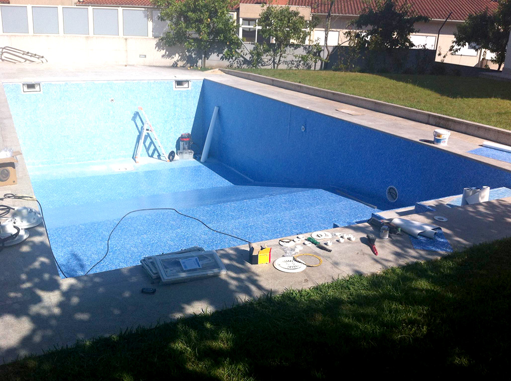 Colocação de tela (imitação de marmora azul), focos de luz, ralo de fundo (para lámina armada), injectores (para lámina armada),boca de aspiração, skimers, perfil vertical, perfil de remate para fixação (para lámina armada). Todo neste processo foi elaborado por profissionais especializados, garantindo a estanquidade da piscina por 15 anos.